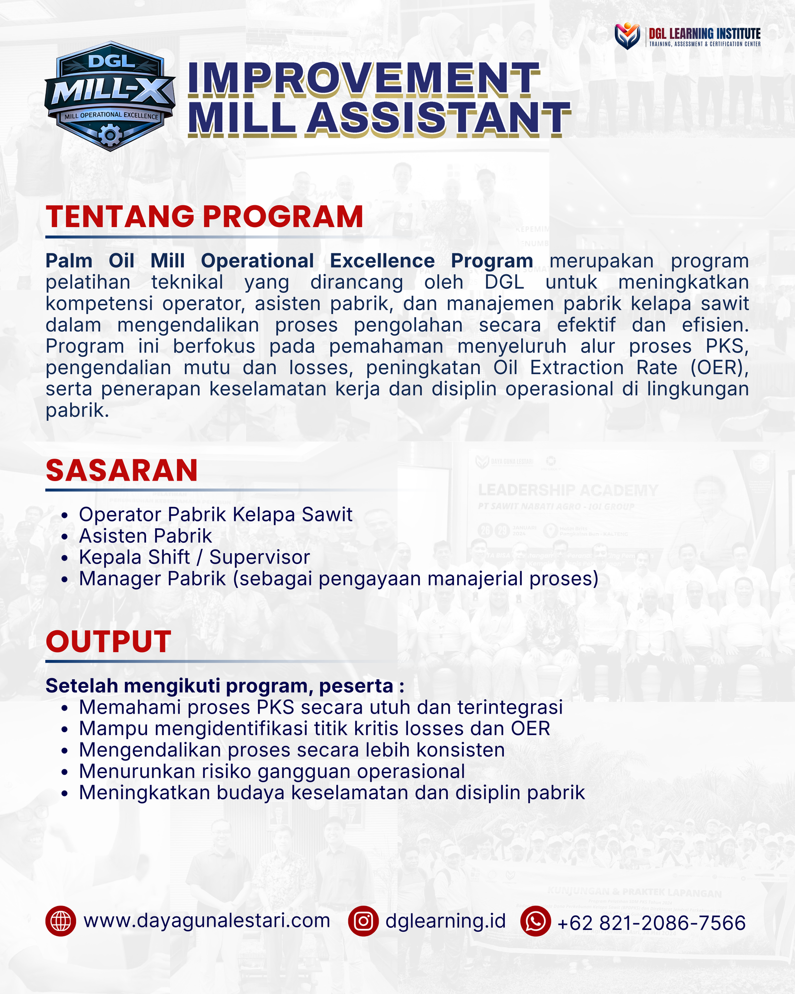 Improvement Mill Assistant merupakan program pelatihan teknikal yang dirancang oleh DGL untuk meningkatkan kompetensi operator, asisten pabrik, dan manajemen pabrik kelapa sawit dalam mengendalikan proses pengolahan secara efektif dan efisien. Program ini berfokus pada pemahaman menyeluruh alur proses PKS, pengendalian mutu dan losses, peningkatan Oil Extraction Rate (OER), serta penerapan keselamatan kerja dan disiplin operasional di lingkungan pabrik.