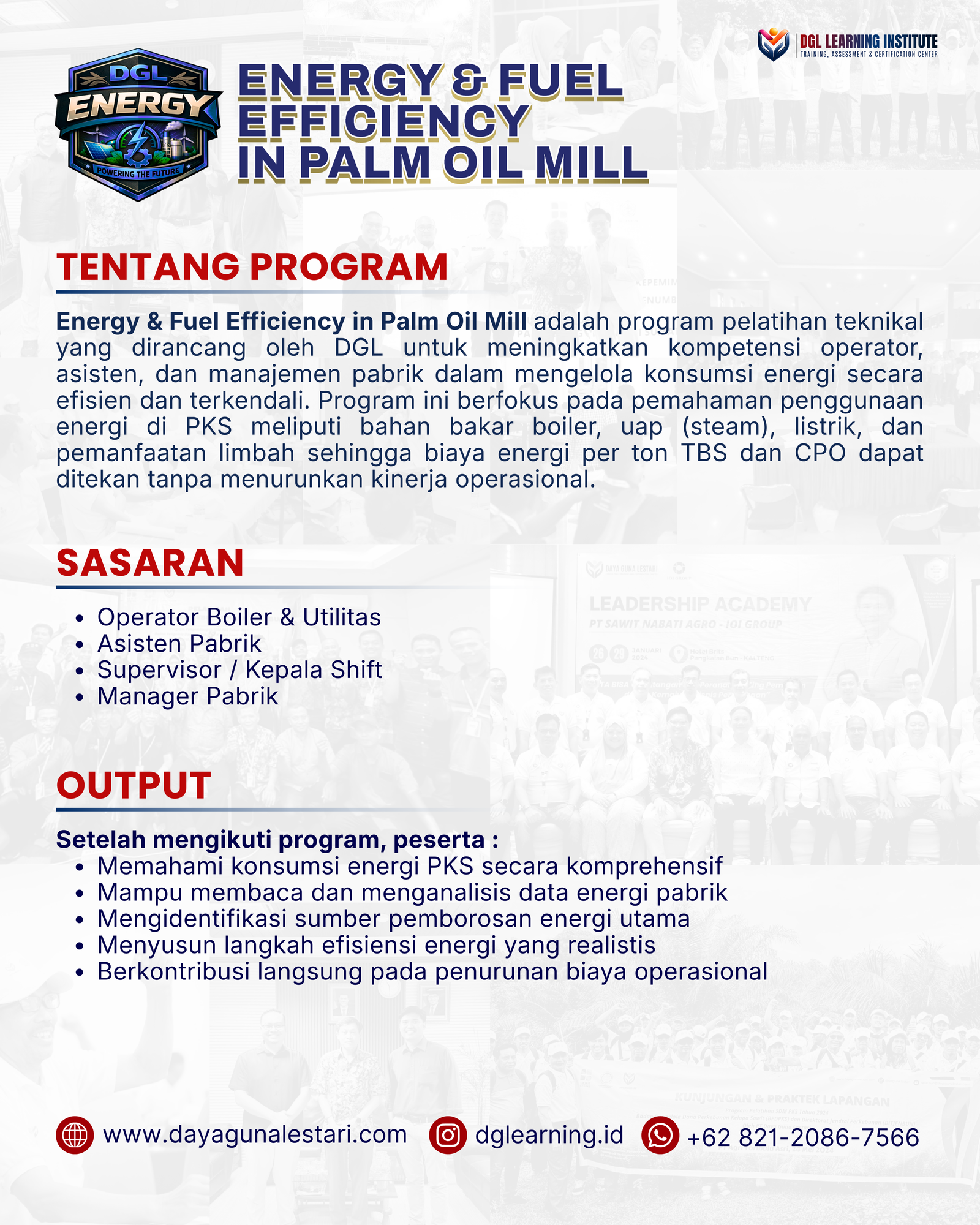 Energy & Fuel Efficiency in Palm Oil Mill adalah program pelatihan teknikal yang dirancang oleh DGL untuk meningkatkan kompetensi operator, asisten, dan manajemen pabrik dalam mengelola konsumsi energi secara efisien dan terkendali. Program ini berfokus pada pemahaman penggunaan energi di PKS meliputi bahan bakar boiler, uap (steam), listrik, dan pemanfaatan limbah sehingga biaya energi per ton TBS dan CPO dapat ditekan tanpa menurunkan kinerja operasional.