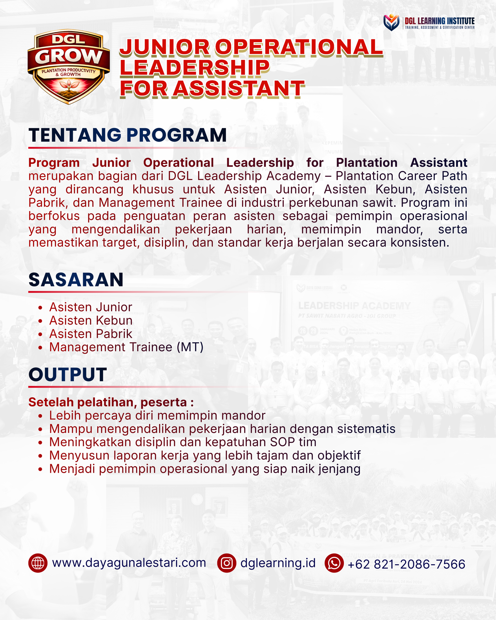 Assistant Leadership merupakan bagian dari DGL Leadership Academy – Plantation Career Path yang dirancang khusus untuk Asisten Junior, Asisten Kebun, Asisten Pabrik, dan Management Trainee di industri perkebunan sawit. Program ini berfokus pada penguatan peran asisten sebagai pemimpin operasional yang mengendalikan pekerjaan harian, memimpin mandor, serta memastikan target, disiplin, dan standar kerja berjalan secara konsisten.