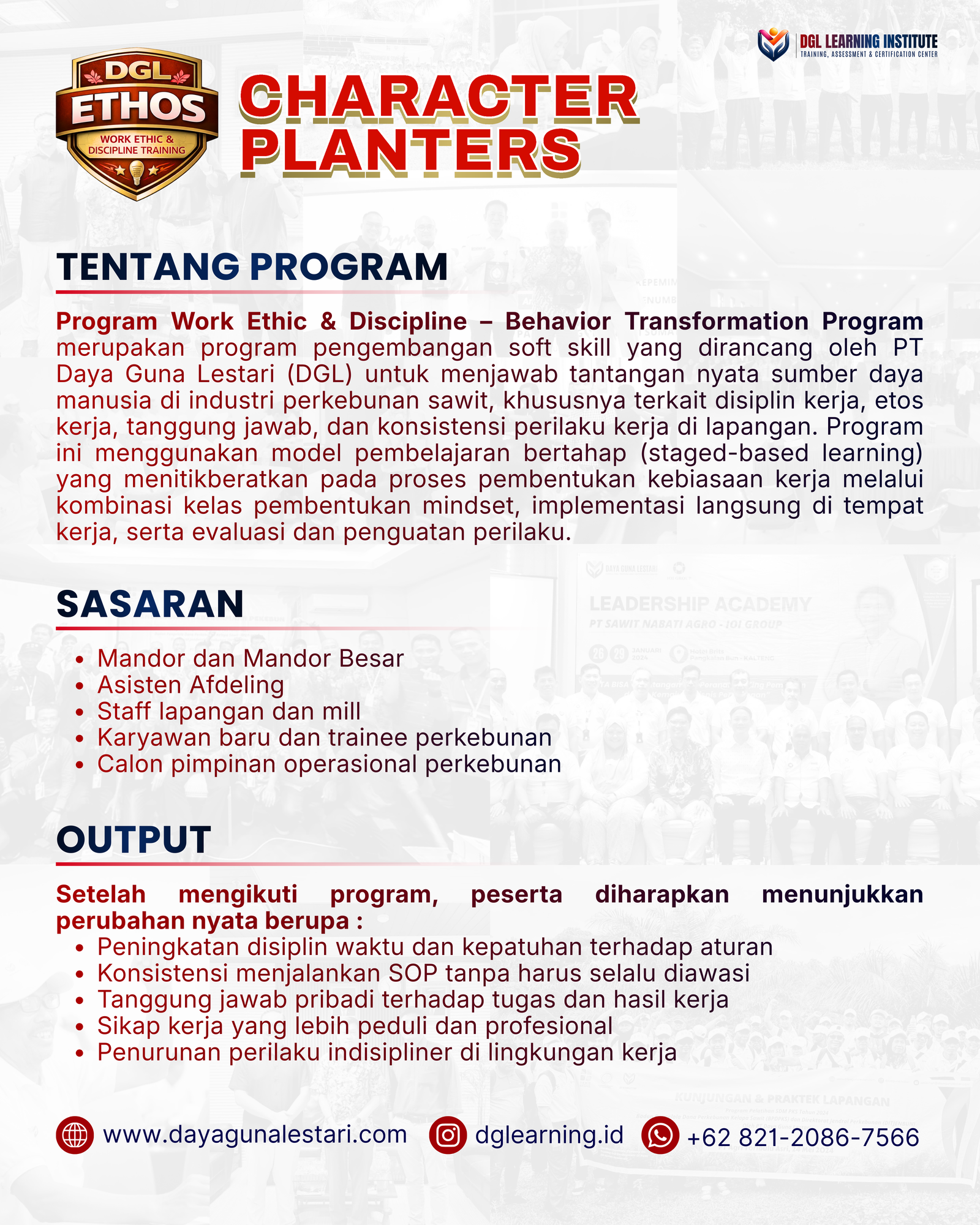 Character Planters merupakan program pengembangan soft skill yang dirancang oleh PT Daya Guna Lestari (DGL) untuk menjawab tantangan nyata sumber daya manusia di industri perkebunan sawit, khususnya terkait disiplin kerja, etos kerja, tanggung jawab, dan konsistensi perilaku kerja di lapangan.