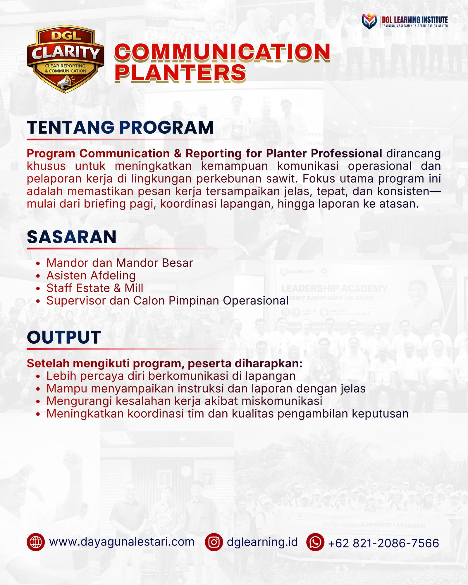 Communication Planters dirancang khusus untuk meningkatkan kemampuan komunikasi operasional dan pelaporan kerja di lingkungan perkebunan sawit. Fokus utama program ini adalah memastikan pesan kerja tersampaikan jelas, tepat, dan konsisten mulai dari briefing pagi, koordinasi lapangan, hingga laporan ke atasan.