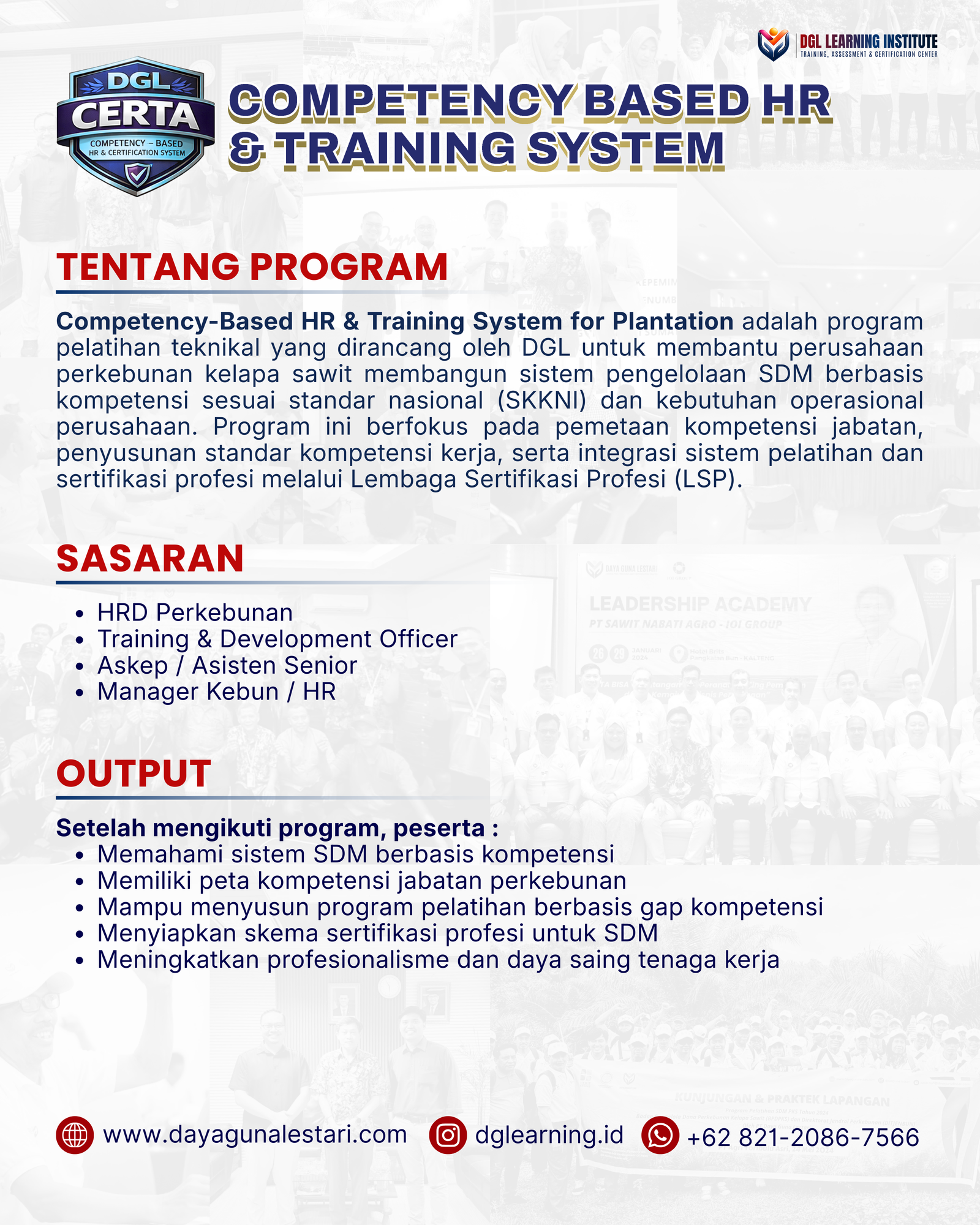 Competency-Based HR & Training System adalah program pelatihan teknikal yang dirancang oleh DGL untuk membantu perusahaan perkebunan kelapa sawit membangun sistem pengelolaan SDM berbasis kompetensi sesuai standar nasional (SKKNI) dan kebutuhan operasional perusahaan. Program ini berfokus pada pemetaan kompetensi jabatan, penyusunan standar kompetensi kerja, serta integrasi sistem pelatihan dan sertifikasi profesi melalui Lembaga Sertifikasi Profesi (LSP).