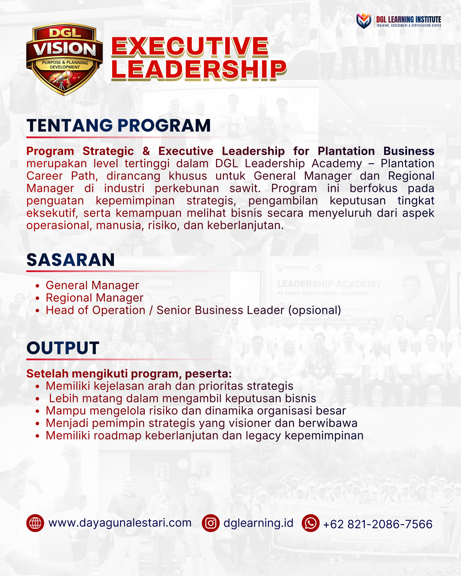 Executive Leadership merupakan level tertinggi dalam DGL Leadership Academy – Plantation Career Path, dirancang khusus untuk General Manager dan Regional Manager di industri perkebunan sawit. Program ini berfokus pada penguatan kepemimpinan strategis, pengambilan keputusan tingkat eksekutif, serta kemampuan melihat bisnis secara menyeluruh dari aspek operasional, manusia, risiko, dan keberlanjutan.
