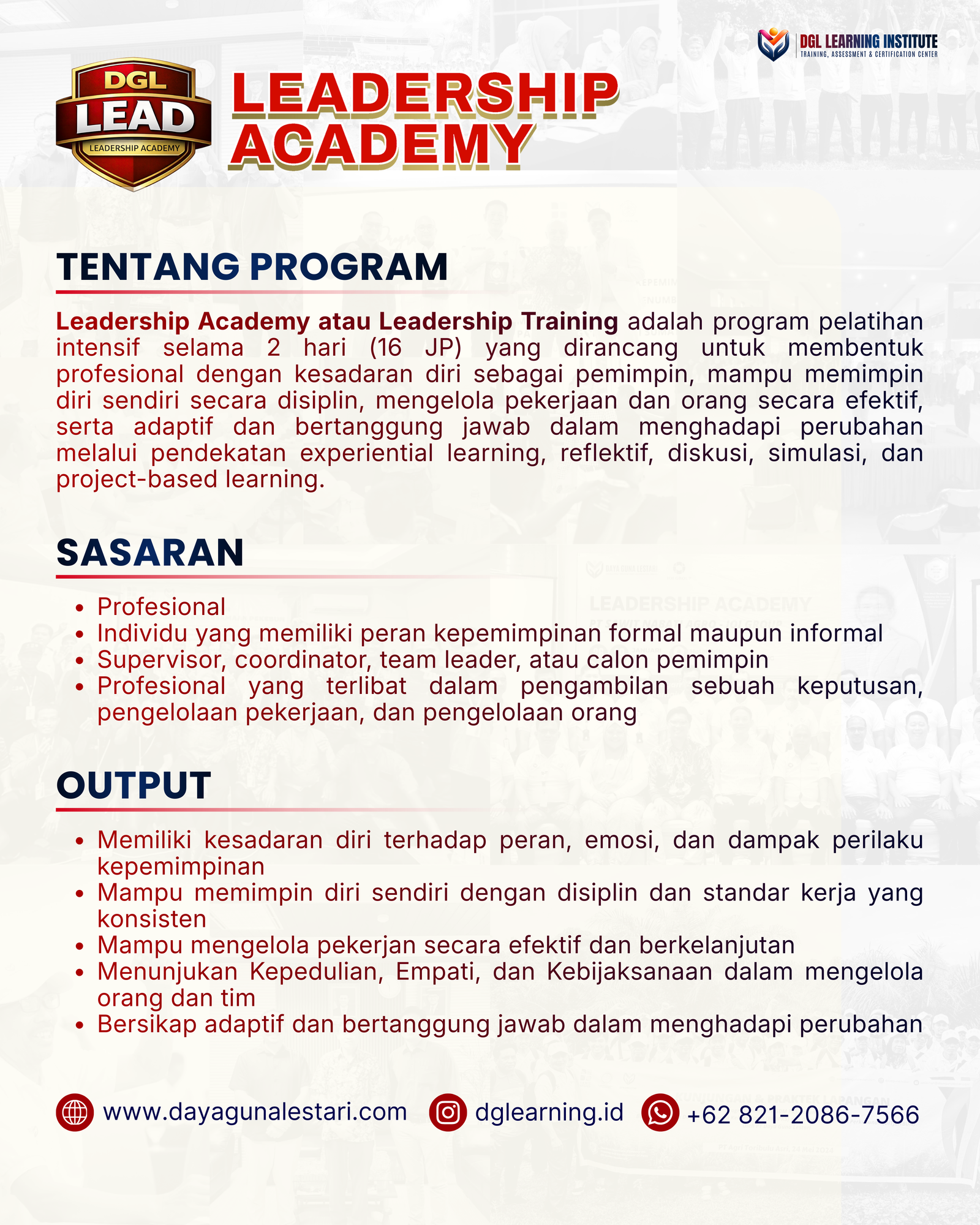 Leadership Academy DGL disusun secara berjenjang dan terintegrasi, mengombinasikan sesi reflektif, diskusi, simulasi, proyek kerja tim, serta outbound leadership untuk memastikan pembelajaran tidak berhenti di ruang kelas, tetapi benar-benar dirasakan dan diterapkan.