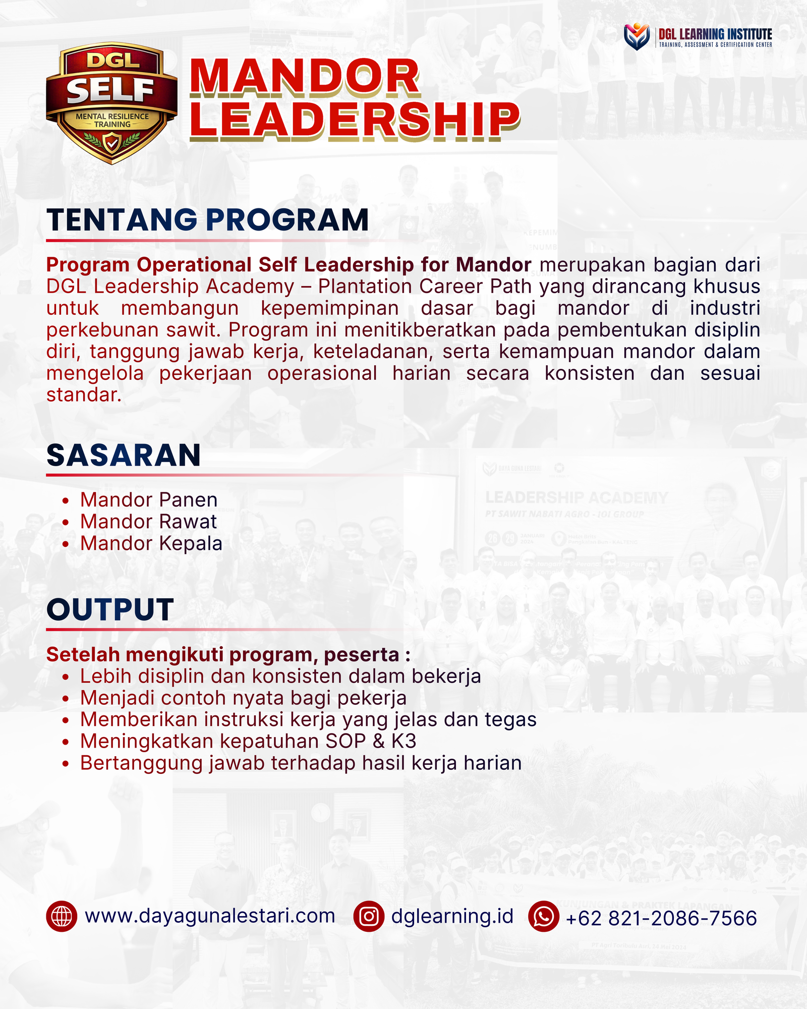 Program Operational Self Leadership for Mandor merupakan bagian dari DGL Leadership Academy – Plantation Career Path yang dirancang khusus untuk membangun kepemimpinan dasar bagi mandor di industri perkebunan sawit. Program ini menitikberatkan pada pembentukan disiplin diri, tanggung jawab kerja, keteladanan, serta kemampuan mandor dalam mengelola pekerjaan operasional harian secara konsisten dan sesuai standar.