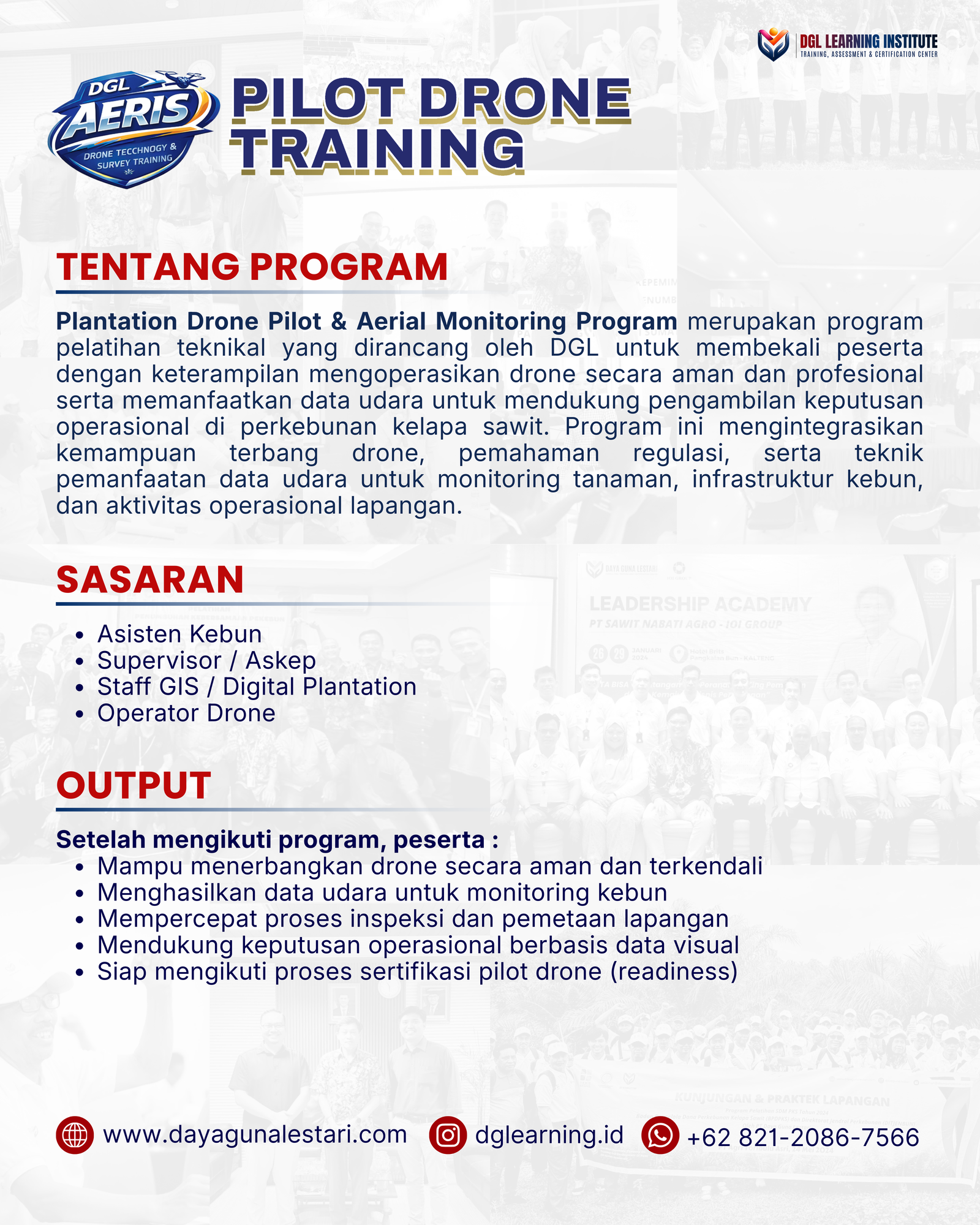 Pilot Drone Training merupakan program pelatihan teknikal yang dirancang oleh DGL untuk membekali peserta dengan keterampilan mengoperasikan drone secara aman dan profesional serta memanfaatkan data udara untuk mendukung pengambilan keputusan operasional di perkebunan kelapa sawit. Program ini mengintegrasikan kemampuan terbang drone, pemahaman regulasi, serta teknik pemanfaatan data udara untuk monitoring tanaman, infrastruktur kebun, dan aktivitas operasional lapangan.