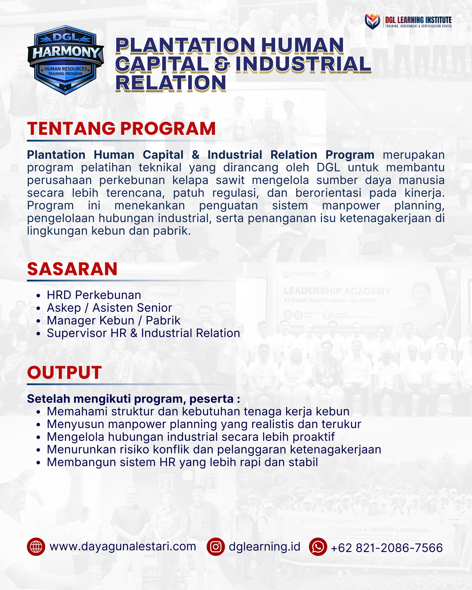 Plantation Human Capital & Industrial Relation merupakan program pelatihan teknikal yang dirancang oleh DGL untuk membantu perusahaan perkebunan kelapa sawit mengelola sumber daya manusia secara lebih terencana, patuh regulasi, dan berorientasi pada kinerja. Program ini menekankan penguatan sistem manpower planning, pengelolaan hubungan industrial, serta penanganan isu ketenagakerjaan di lingkungan kebun dan pabrik.