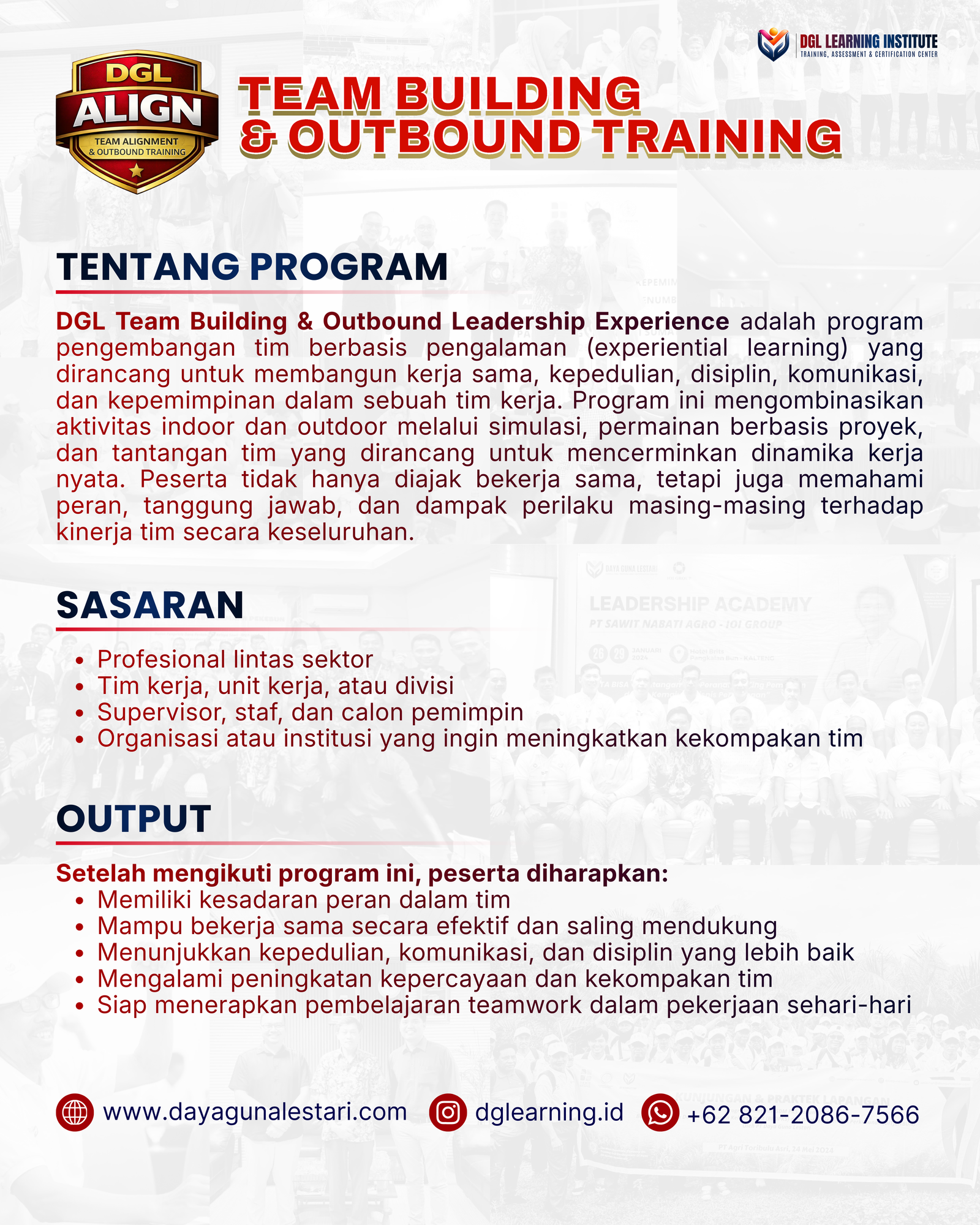 Team Building & Outbound Training adalah program pengembangan tim berbasis pengalaman (experiential learning) yang dirancang untuk membangun kerja sama, kepedulian, disiplin, komunikasi, dan kepemimpinan dalam sebuah tim kerja.