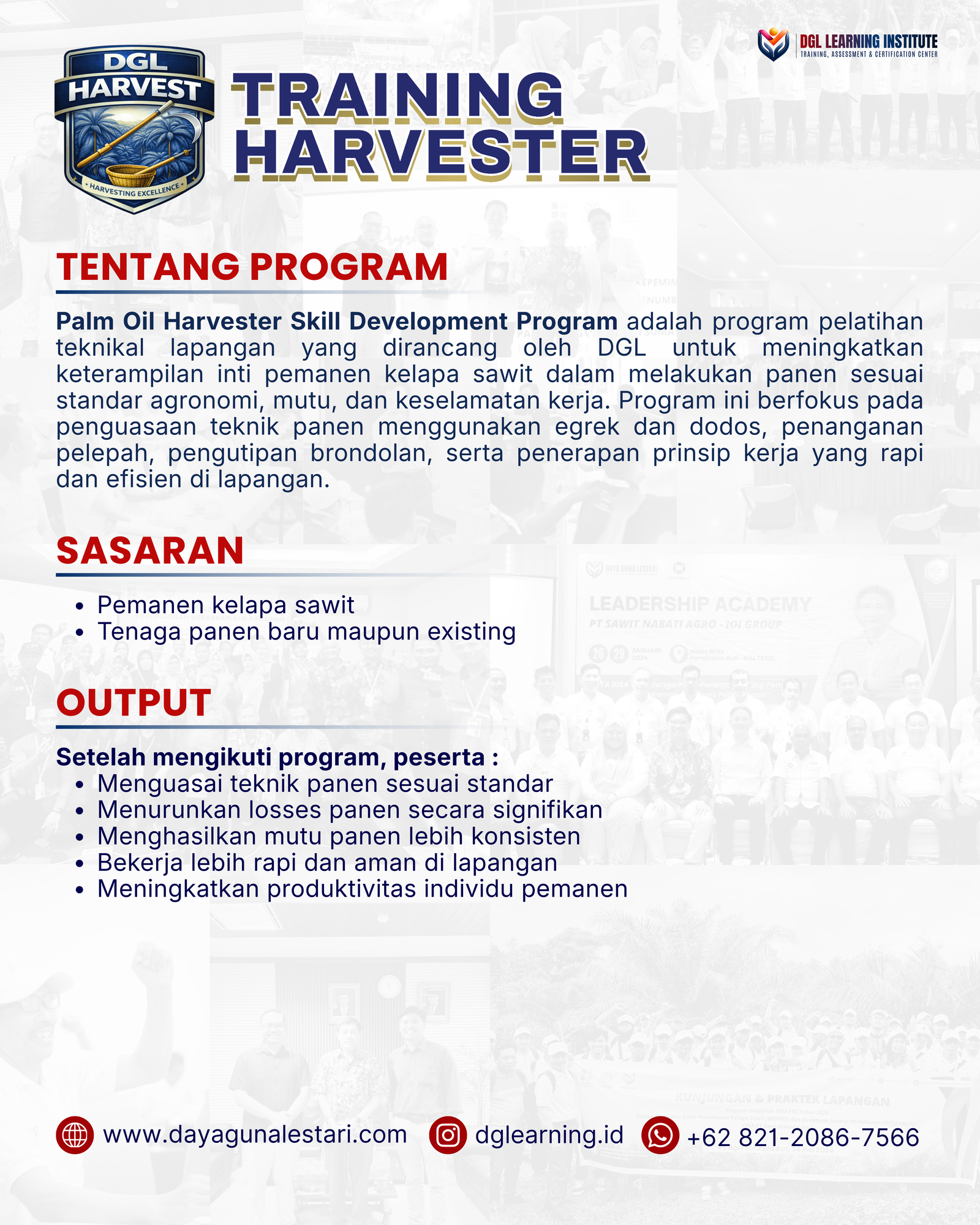 Training Harvester adalah program pelatihan teknikal lapangan yang dirancang oleh DGL untuk meningkatkan keterampilan inti pemanen kelapa sawit dalam melakukan panen sesuai standar agronomi, mutu, dan keselamatan kerja. Program ini berfokus pada penguasaan teknik panen menggunakan egrek dan dodos, penanganan pelepah, pengutipan brondolan, serta penerapan prinsip kerja yang rapi dan efisien di lapangan.