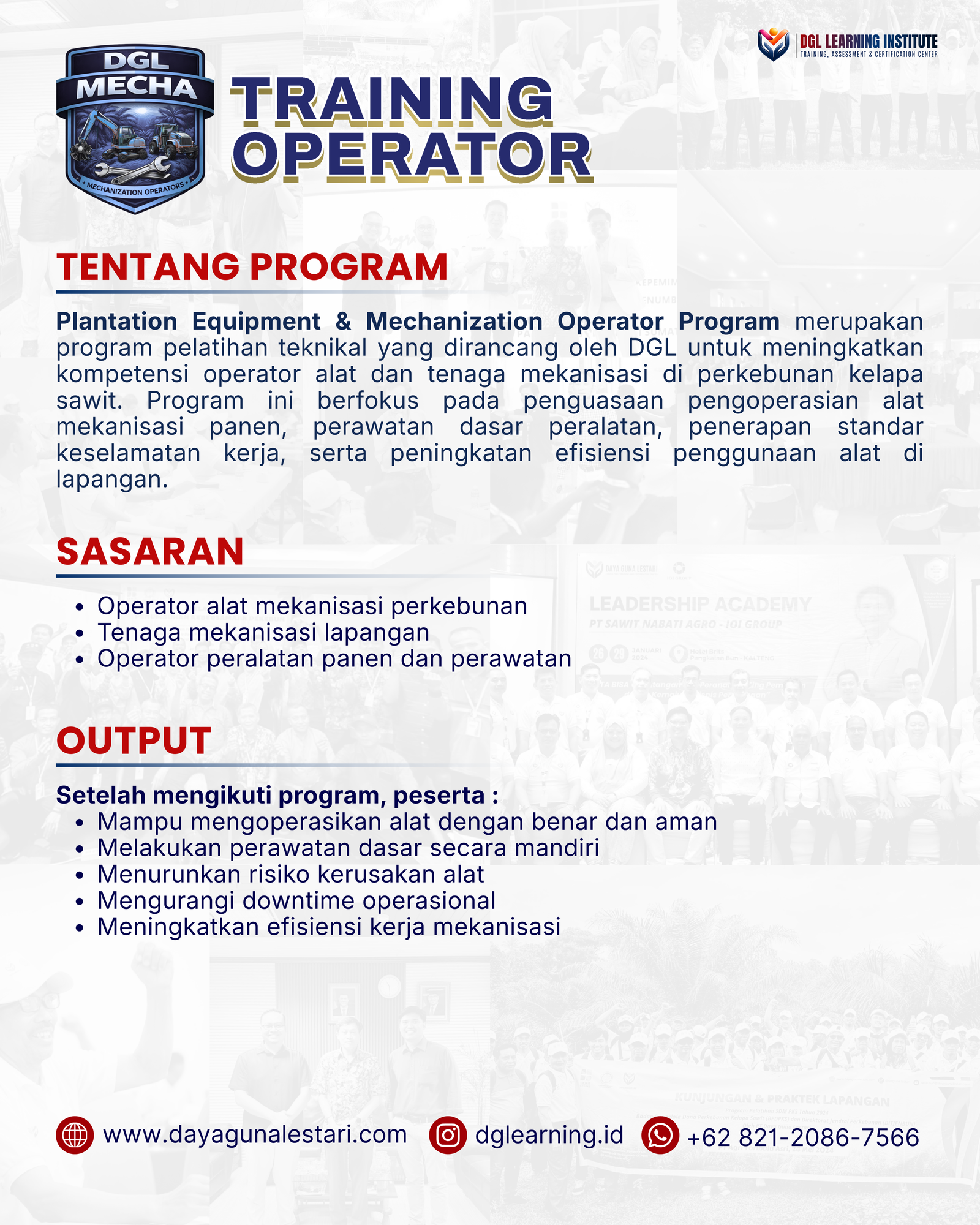 Training Operator merupakan program pelatihan teknikal yang dirancang oleh DGL untuk meningkatkan kompetensi operator alat dan tenaga mekanisasi di perkebunan kelapa sawit. Program ini berfokus pada penguasaan pengoperasian alat mekanisasi panen, perawatan dasar peralatan, penerapan standar keselamatan kerja, serta peningkatan efisiensi penggunaan alat di lapangan.